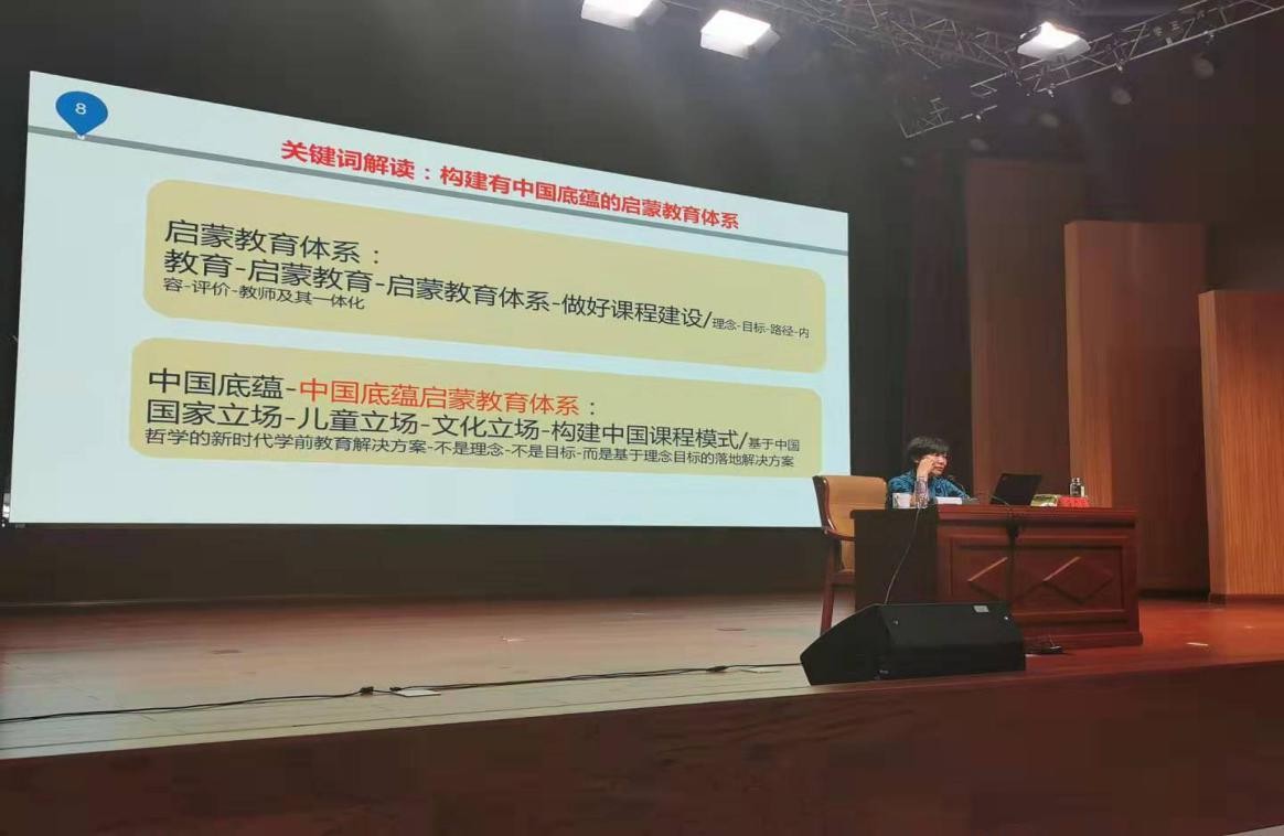 为了培养新时代的卓越幼儿园教师,霍力岩教授提出构建有中国底蕴的启蒙教育体系。她指出在深化改革、规范发展的学前教育新时代新征程中,我们要一起努力构建具有国家立场、儿童立场、文化立场的中国幼儿园课程模式,形成基于中国哲学、中国智慧、时代特色和基于理念目标的落地学前教育解决方案。她希望师范院校能够为国家培养出更多的有中国立场、会中国本领、具备岗位胜任力的幼儿园教师,同时还对在座的各位同学提出了殷殷期盼。