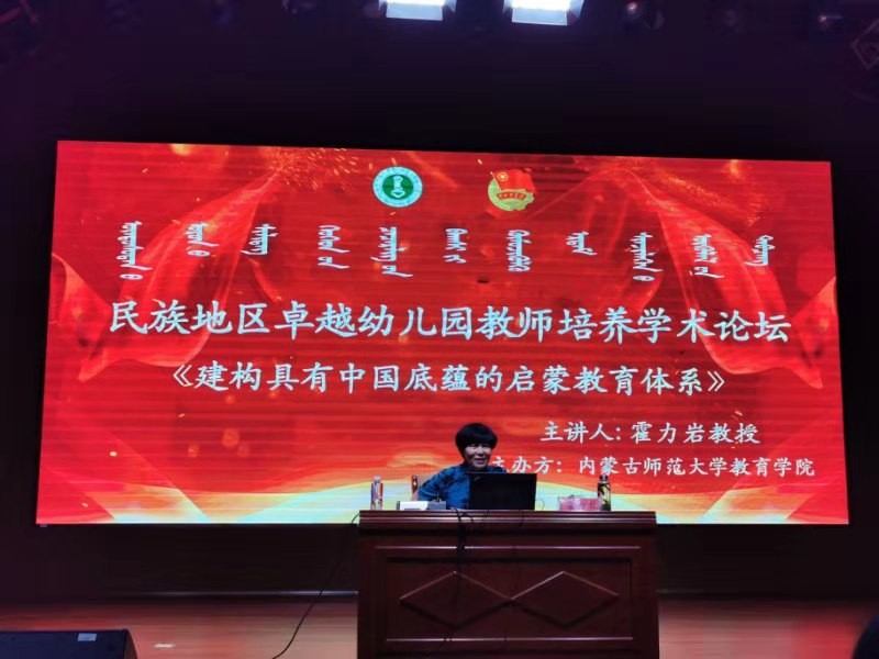 9月21日上午,我院在学校盛乐校区图书馆二楼报告厅成功举办了“民族地区卓越幼儿园教师培养学术论坛”。本次论坛的主讲人是北京师范大学教育学部学前教育研究所的霍力岩教授,论坛主题为“构建有中国底蕴的启蒙教育体系——兼谈迈向‘深化改革规范发展’之‘办好学前教育’新时代”。论坛由内蒙古师范大学民族地区卓越幼儿园教师培养项目负责人朱晓红教授主持,学院相关教师、本科生、研究生以及基层幼儿园领导和教师代表等参加了本次论坛。