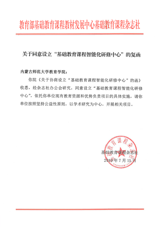 为推广基础教育课程改革的深入实施,教育部基础教育课程教材发展中心基础教育课程杂志社委托我院设立“基础教育课程智能化研修中心”,该中心以我院现有的教育资源和优势为依托,其具体工作的实施和相关项目的开展由教育学院负责。 目前,教育部基础教育课程教材发展中心基础教育课程杂志社仅在北京师范大学珠海校区和我校设立了基础教育课程智能化研修相关机构。