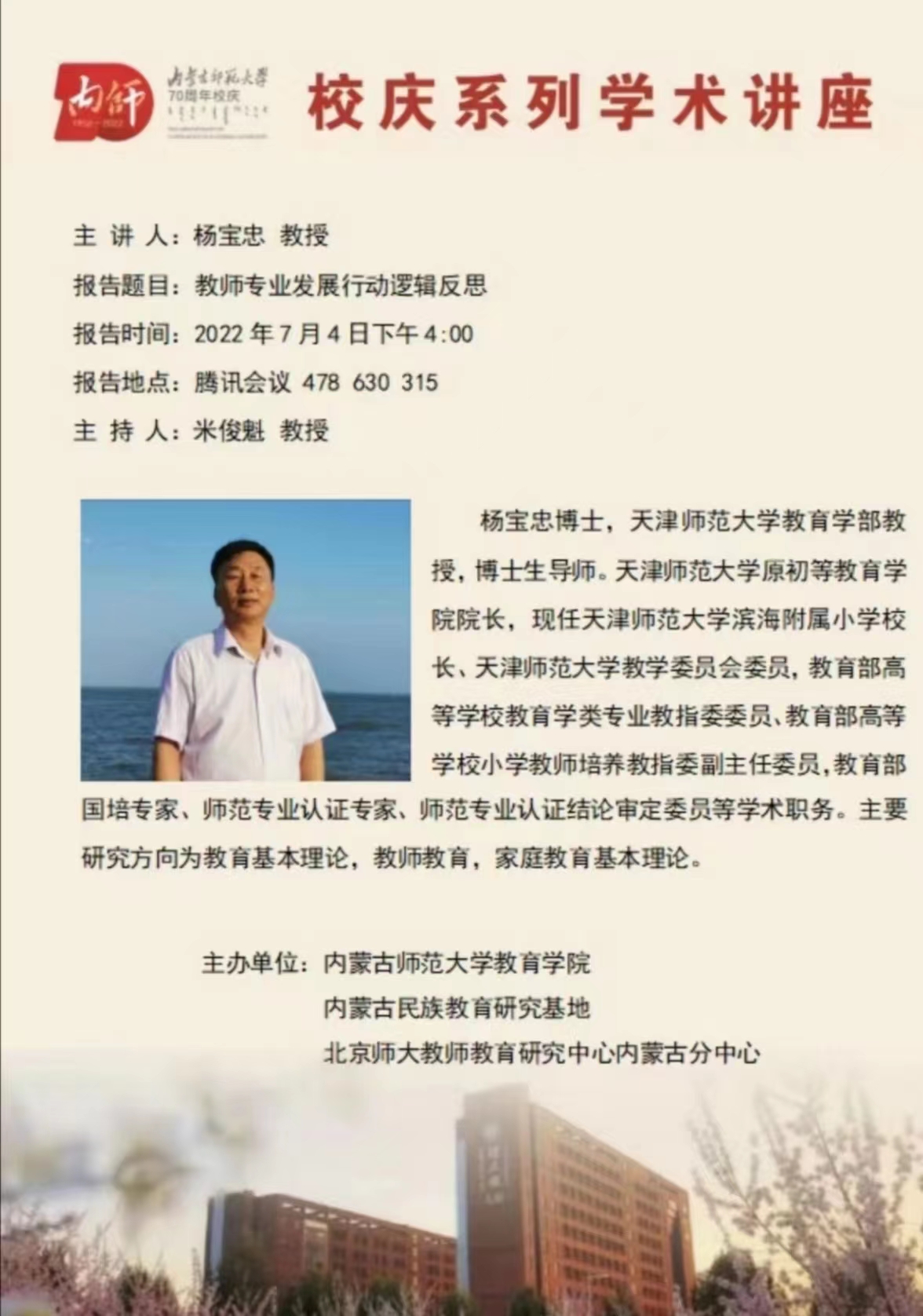 202274日,天津师范大学教育学部博士生导师、杨宝忠教授,通过腾讯视频会议,线上为教育学院全体师生,做了题为“教师专业发展行动逻辑反思”的学术报告。报告会由米俊魁院长主持,小学教育专业200多位师生聆听了学术报告。