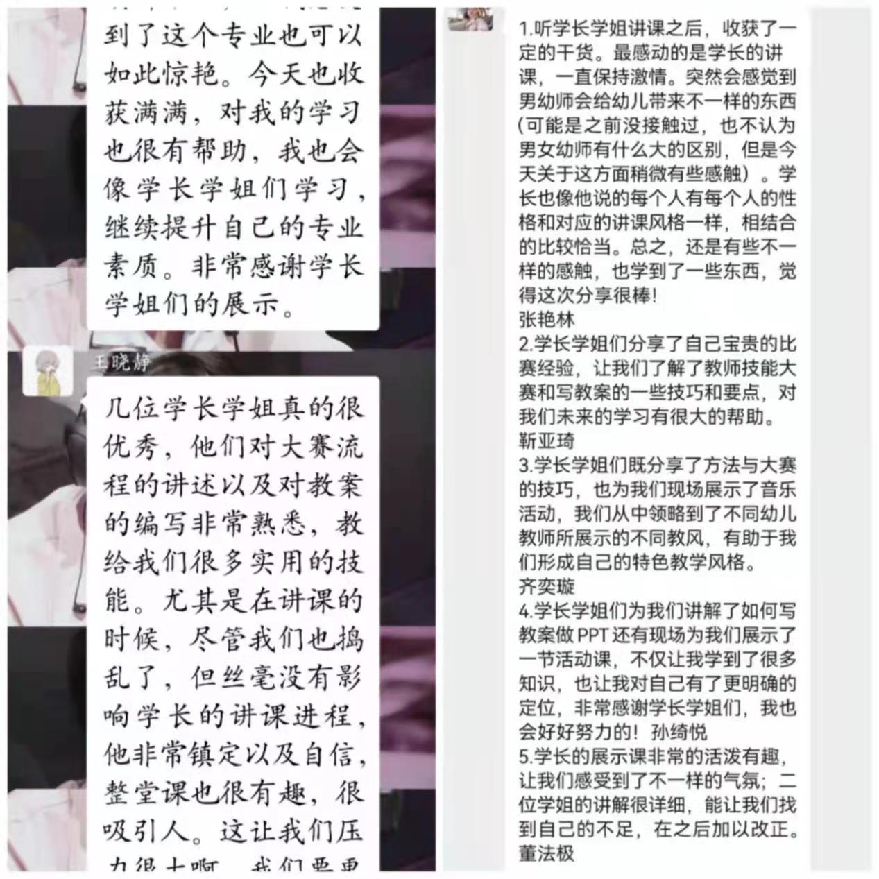 为发扬学前专业良好的帮传带作风,促进参赛选手进行自我反思、自我内化。于2021年11月4日老师们组织了专业学习会,2019级3位学长学姐们对2020级的学弟学妹们进行了模拟课堂展示,分享如何书写教案以及如何制作PPT的心得体会,学弟学妹们收获颇丰。分享结束后2020级同学们针对自身问题与学长学姐交流,学长学姐结合自身实际与老师的教诲进行答疑解惑。本次专业学习会为2020级同学日后的学习与自己未来的发展方向的指引起到了巨大的促进作用。