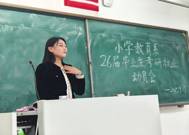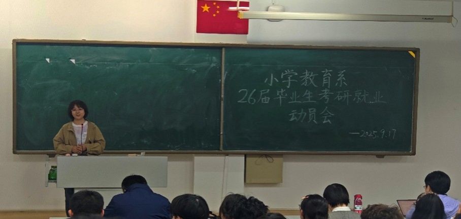 2025年9月17日晚7点,小学教育系2026届毕业生考研就业动员会在盛乐校区行知楼正式召开。教育学院党委书记周越、小学教育系支部书记成欣欣、实践部主任马红斐、系主任常红梅、青年教师代表李晓贺和研究生代表、2023—2025级本科生代表以及2026届全体毕业生共同参会,现场气氛活跃。