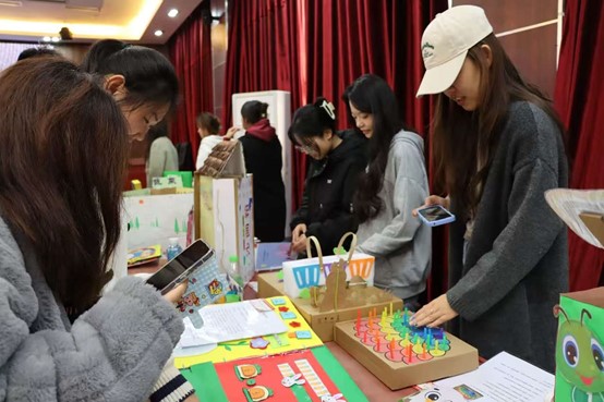 课间,内蒙古师范大学的师生们在呼和浩特市特殊教育学校老师的带领下,参观了第三届教师自制教玩具展览。这些教具专门为智力障碍、视力障碍和听力障碍等不同类型的学生的教育与康复需求而设计,充分体现了呼和浩特市特殊教育学校教师们的创造力和精湛技艺,也反映了呼和浩特市特殊教育学校在教育创新方面的努力与成就。