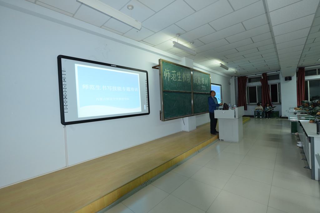 白羽教授首先强调了写字和书法的不同,书写是一种能力,是教育的基本素养。要求师范生要心里想着,手里就能写。白羽教授从排版设计、笔法结构、速度三方面说明了黑板书写的要求。