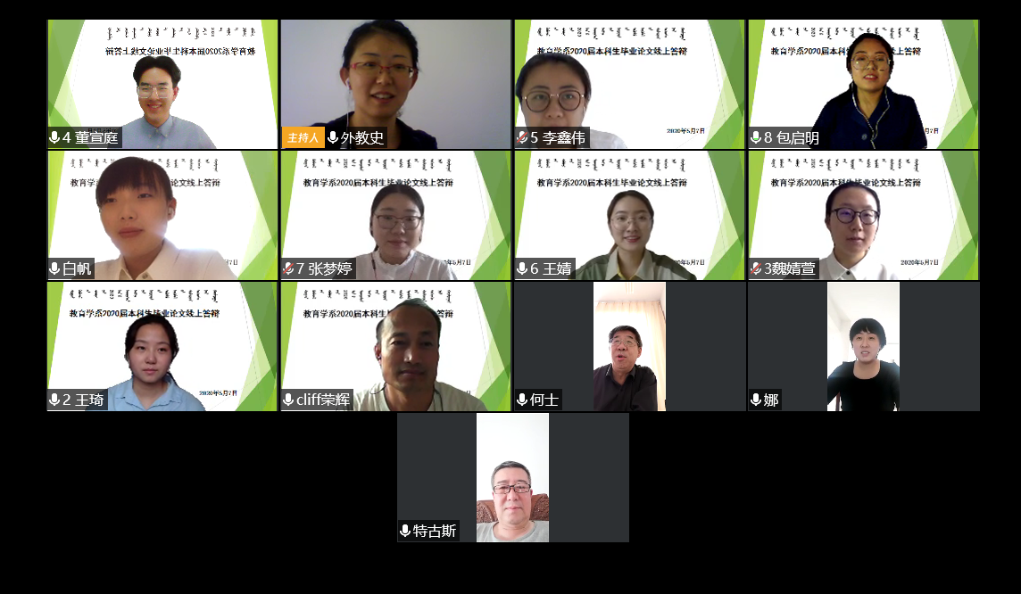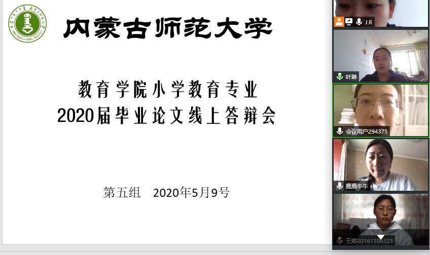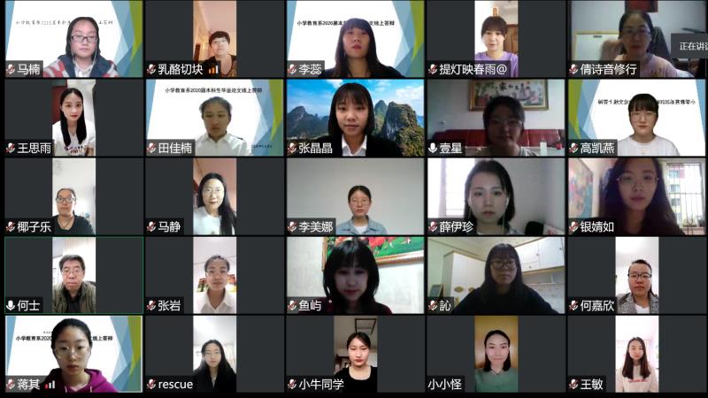根据学校疫情防控期间毕业生相关工作要求,教育学院2020届本科毕业生进行在线论文答辩。教育学、学前教育、教育技术、小学教育、特殊教育和公共事业管理等专业在5月7日到5月9日三天陆续举行答辩会,先后有570余名本科毕业生参与答辩。