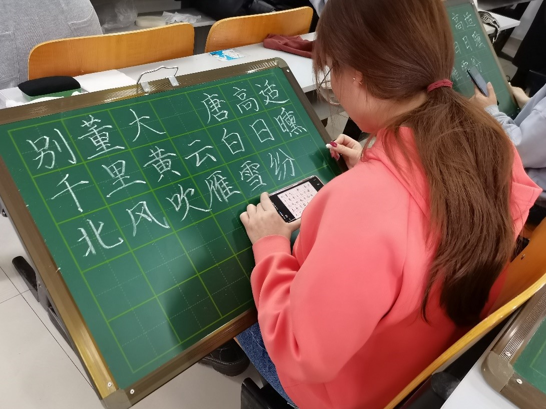经过综合考评《师范生粉笔字训练》作业成绩,共有128名同学作品脱颖而出,进入决赛。参赛学生按照指定内容进行书写,书写时间为30分钟。比赛场面紧张、有序、氛围浓厚,参赛学生个个用心书写,挥洒自如,一幅幅遒劲有力的粉笔字,如行云流水,飘逸舒展。