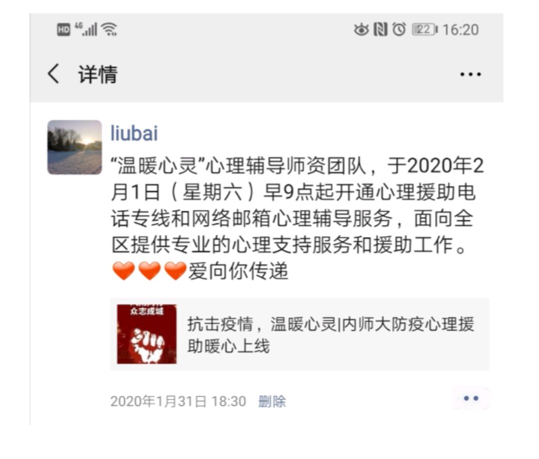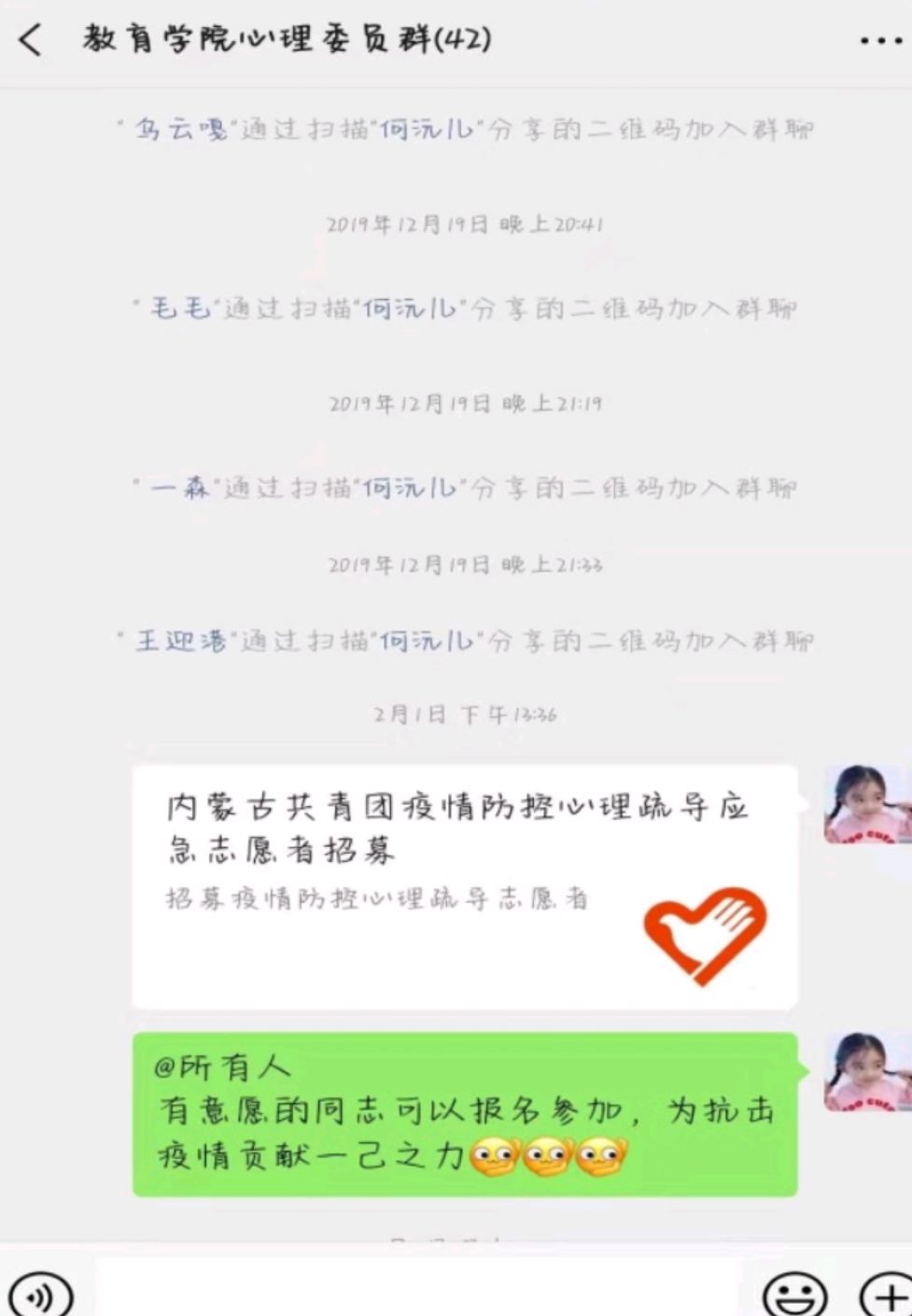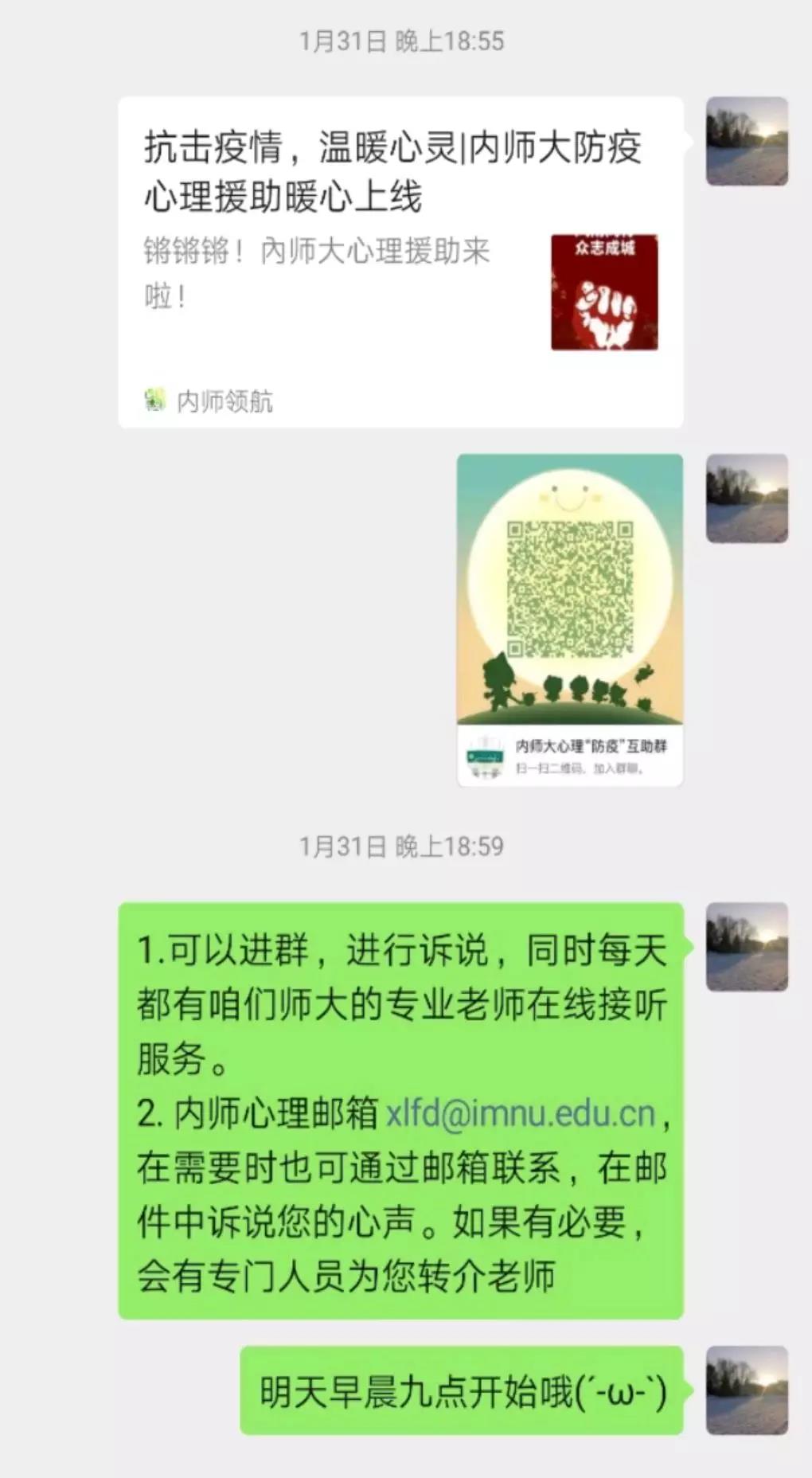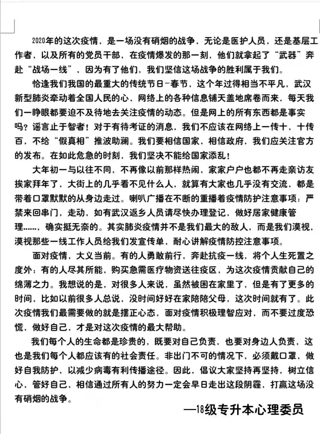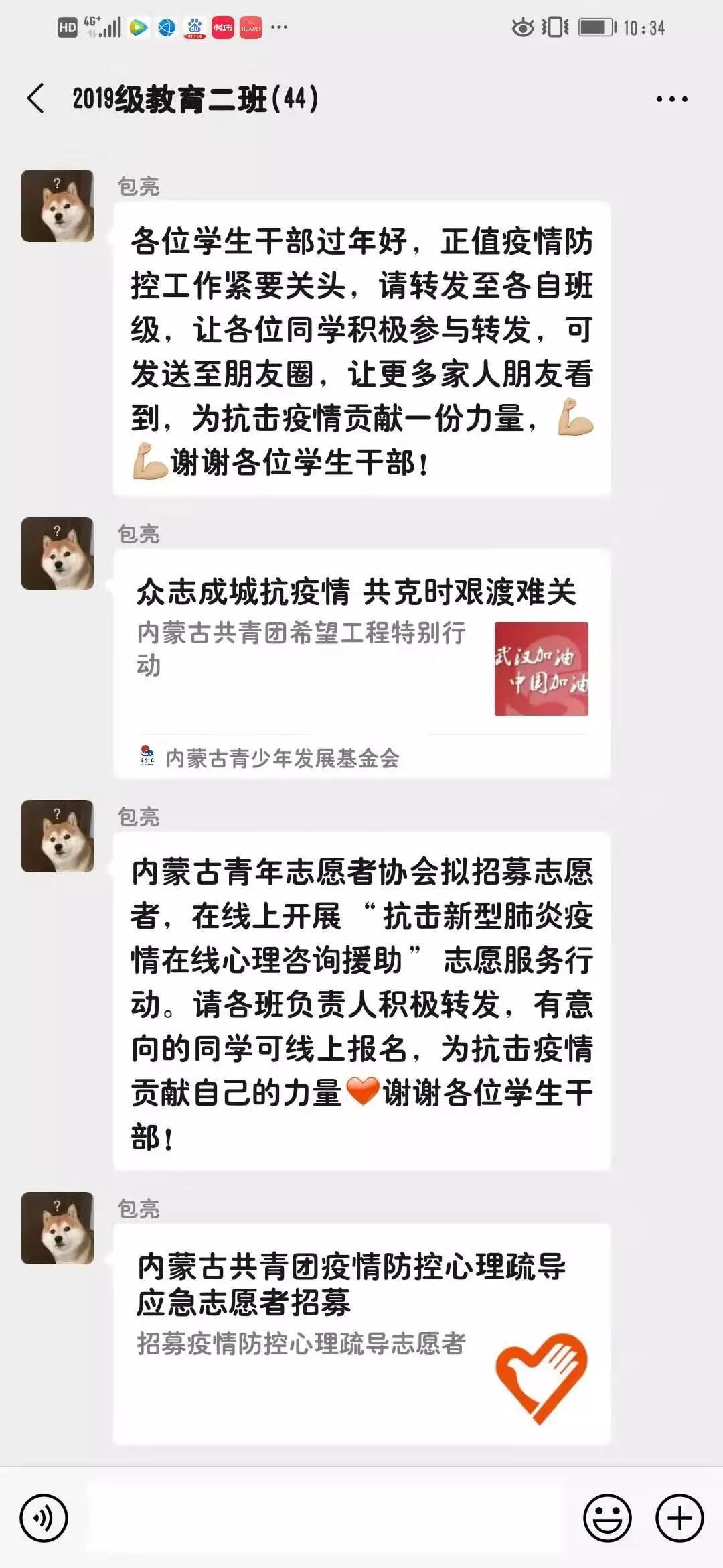 在这共克时艰的特殊时期,教育学院各班心理委员牢记自己的责任和使命,密切关注同学们的心理动态,积极对同学们进行心理辅导,转发心理疏导的相关文章,极大地缓解了同学们焦虑不安的心情。