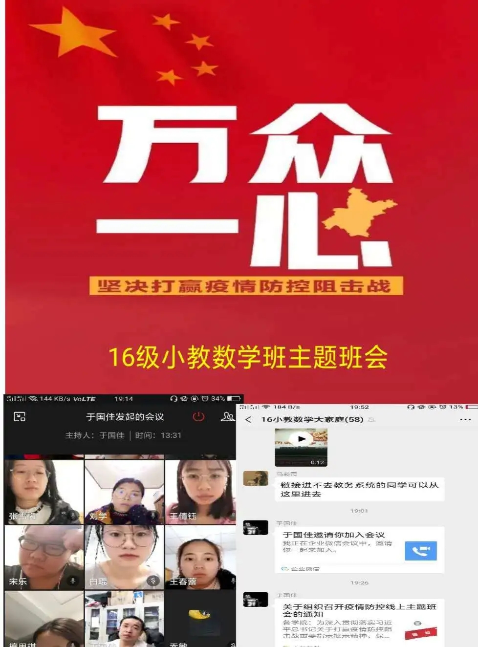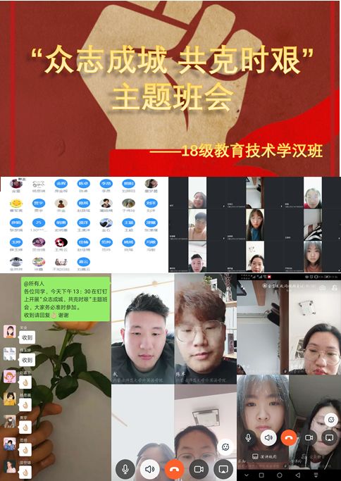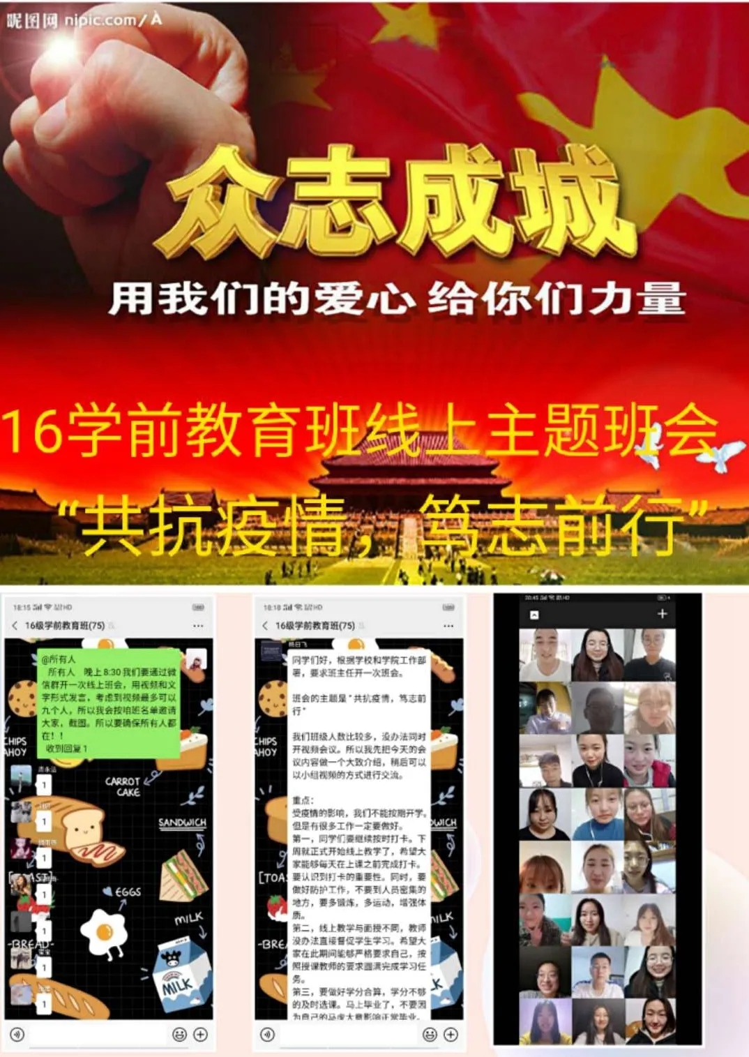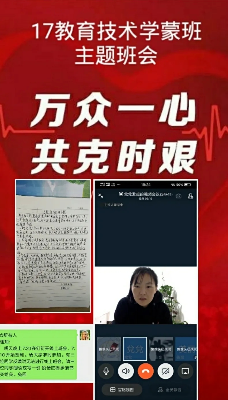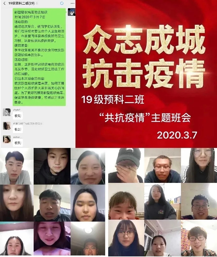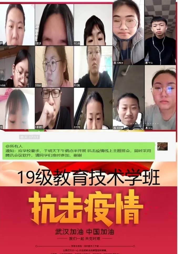 为深入贯彻落实习近平总书记关于打赢疫情防控阻击战重要指示批示精神,保障防控疫情期间“停课不停学”,充分发挥网络育人功能,根据自治区和学校有关工作部署,教育学院各班级组织召开“共抗疫情,笃志前行”为主题的疫情防控线上班会。