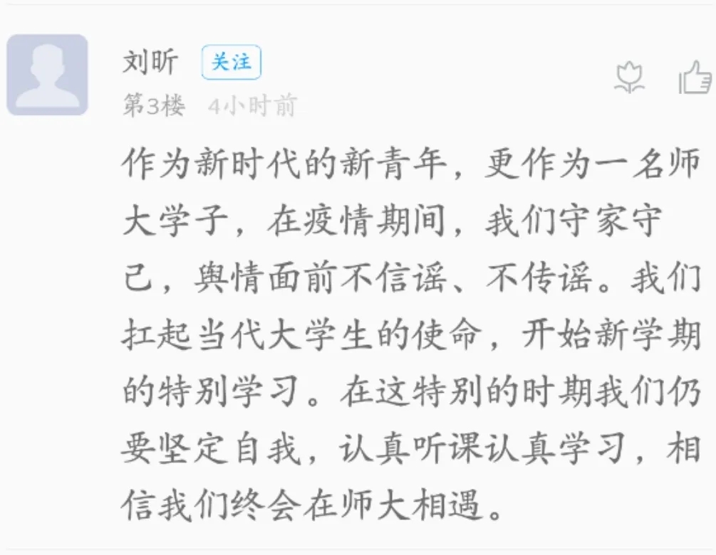 这是一次特殊的开学,一样的老师同学,不一样的开学“配方”,不一样的欢聚;一样的讲授互动,不一样的交流平台,不一样的火花。黄雅丽书记在讲话中以“同心战疫,砥砺成长”为主题,讲述了有关疫情的措施、安排,为学生的网络授课和就业实习做出指导,并对所有同学提出六个希望,让我们真切感受到学校的负责,如校训一般,真正的“献身,求实,团结,奋进”。正式开学后,我们会端正心态,认真对待网课,寻找到它的意义与价值;我们也会努力完成六个希望,真正做到心怀感恩、勇于担当、善于思考、心存敬畏、保持理性、体悟亲情。众志成城,共克时艰,希望疫情可以早些过去,我们可以在师大校园相约,听书声袅袅,看云卷云舒,赏春光无限,盼明日朝阳。
