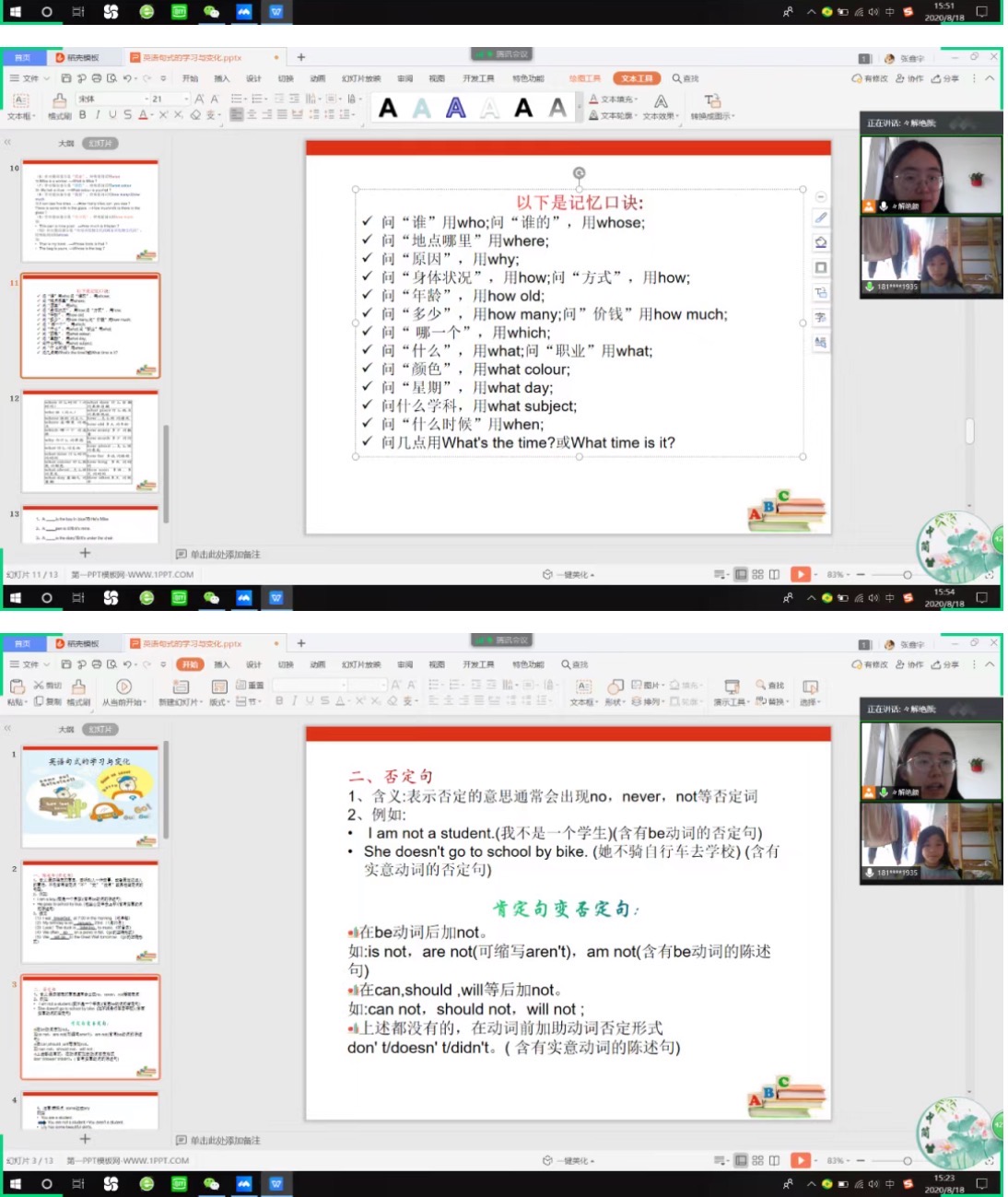 在上课前先复习了时态的相关内容,在讲解作业时发现廖同学在一般现在时第三人称单数变化时还有点区分不清,所以我通过习题和更进一步的讲解为她说明了单三的变化规律。今天学习的内容是英语句型及其变化,包括陈述句、否定句、一般疑问句和特殊疑问句。在讲解四种类型的句子时我都采用知识点+习题的方法,让她在听完知识点后可以及时的在习题中回顾。这几种类型我发现廖同学在肯定句变否定句时问题较大,所以我带着她一句一句分析,课后留下否定句作业来练习。同时在特殊疑问句中廖同学会把部分特殊疑问词混淆,我将知识点内容讲解完后发给她让她继续熟悉。廖同学在整个学习过程中态度积极,今天发现她对于这些内容掌握的较好,学习渐入佳境,希望她可以继续保持对英语的兴趣。