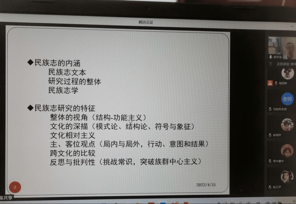2022年4月15日,我院邀请北京市社会科学院社会研究所副研究员陈学金博士作题为《田野工作与民族志研究导引》的学术讲座。陈学金博士对民族志的内涵、特征、不同学科民族志研究的异同、民族志和田野工作之间的关系进行探讨,在并结合三案例,围绕田野工作开展的方式方法、研究问题的凝练、文本的架构、理论的探讨与分析等多方面内容进行了深入阐述。讲座由教育学院陶格斯博士主持,本校民族教育学、课程与教学论等专业的研究生和本科生及校外师生参加。提问与交流环节中,陈学金博士推荐了人类学方法论的书籍,并分享了读书、写文章的方法与经验。