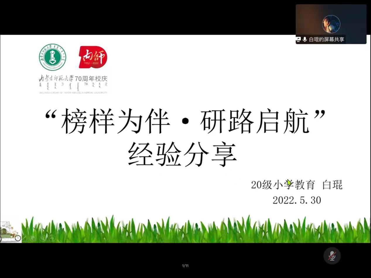 为充分发挥优秀学子的示范引领作用,激励研究生笃学慎思、锐意进取,教育学院于2022年5月30日19:00线上开展了主题为“榜样为伴,研路起航”研究生国家奖学金获得者事迹宣传活动,邀请2021年国家奖学金获得者马瑞萍、白琨两位同学进行分享交流。参与此次活动的有学院党委副书记、副院长斯琴满都呼、副院长赵荣辉、研究生教学秘书赵元韬和学院全体研究生及部分本科生。