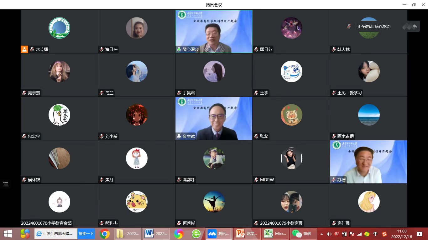 2022年12月16日上午,因疫情防控所需,于腾讯会议召开了我院赵荣辉教授主持承担的2022年度国家社会科学基金教育学西部项目“蒙古族传统劳动教育的传承与创新研究”的开题评议会。评议专家组由苏州科技大学金生鈜教授、中央民族大学苏德教授、华中师范大学王学教授、山西大学侯怀银教授、内蒙古师范大学米俊魁教授组成,会议由内蒙古自治区教育科学研究与监测评估院刘彦泽院长主持。
