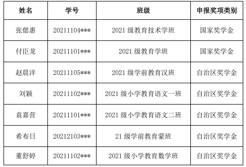 依据《内蒙古师范大学国家奖学金评选办法》(校发[2008]45号)、《关于开展2022—2023学年国家奖学金评审工作的通知》、《关于开展2022—2023学年自治区奖学金评审工作的通知》、《教育学院“国家奖学金、内蒙古自治区奖学金”评选工作实施细则》等文件精神,经过学生申请、班级推荐以及学院党政联席会议讨论,拟推荐以下学生分别申报国家奖学金和内蒙古自治区奖学金。